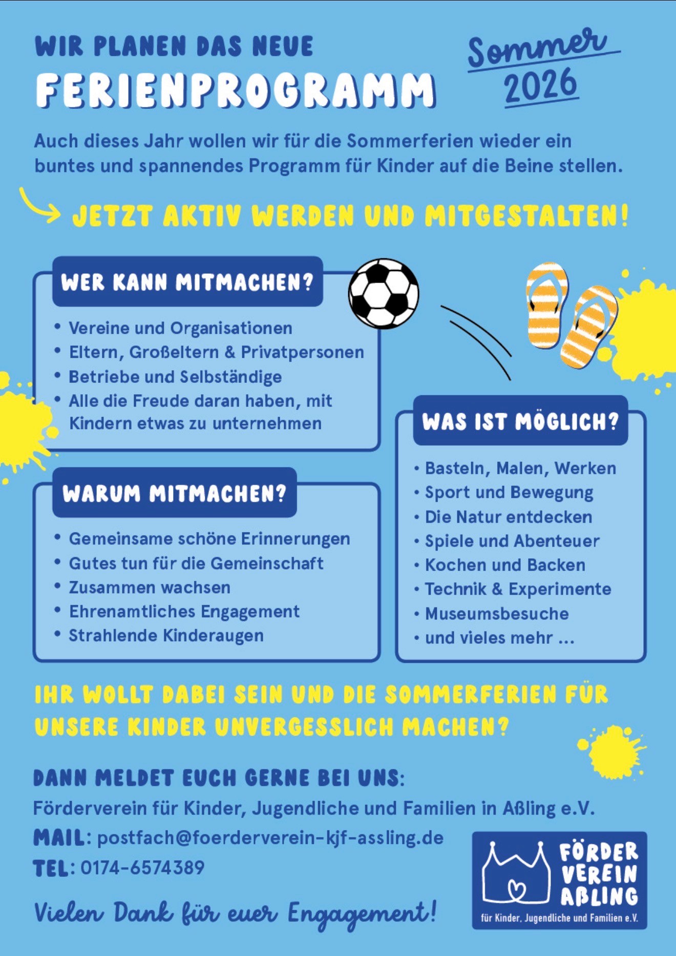 Liebe Aßlinger, die Planungen für das Ferienprogramm 2022 laufen auf Hochtouren. Wir freuen uns riesig wieder ein richtig großes Programm zusammen stellen zu können, auch ein gedrucktes Heft wird es dieses Jahr wieder geben. Jetzt brauchen wir noch fleißige Helfer,...